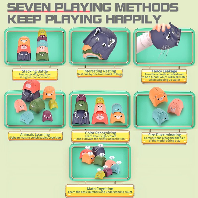 - 💧 Animal Stacking Cups Bath Toy - This stacking baby toys contains 8 colorful animal cups such as elephant, cow, bear, dog, lion, sheep, koala and rabbit. Babies can learn to recognize colors, size and animals. can help improve their hand-eye coordination and logical thinking.