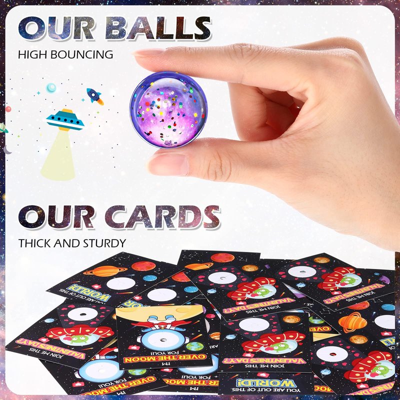 - Reliable and Sturdy: made of 350gsm cardstock, our space theme Valentine's card is thick and well printed; And the bounce ball set adopts quality rubber material, is serviceable and lightweight, odorless and safe for most people to use on Valentine's Day