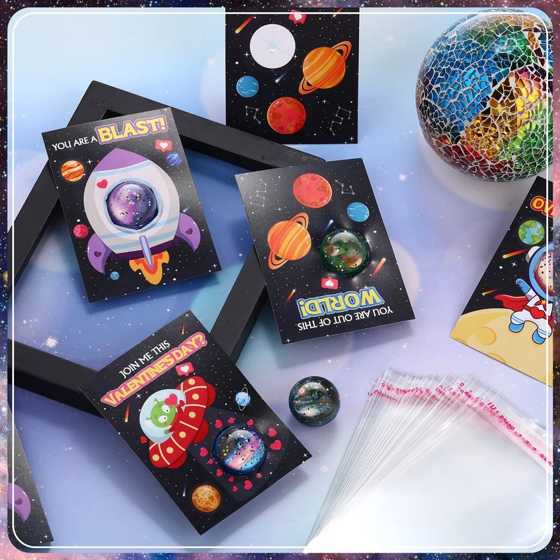 - Abundant Space Party Favor: the package comes with 28 pieces space bounce balls bulk in random patterns, 28 pieces space Valentines Day cards in 4 styles, 50 pieces clear self adhesive bags and 1 piece white marker pen, which are nice combinations for you to use at space themed Valentine's Day