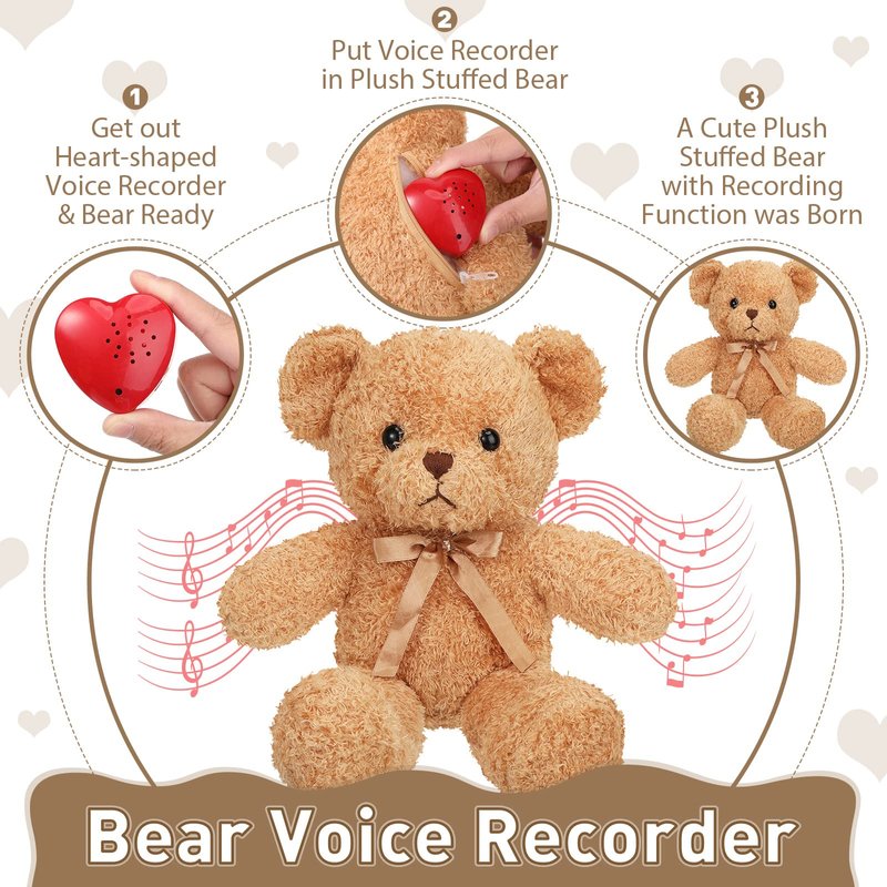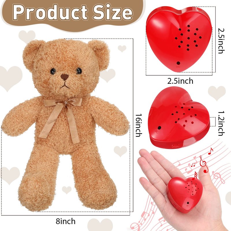 - You Will Get: there are 1 piece of 60 seconds heart voice recorder and 1 piece of 16 inch bear stuffed animal; The recorder allows you to record 60 seconds message or music, and you can easily record the message again until you get the desired message you want