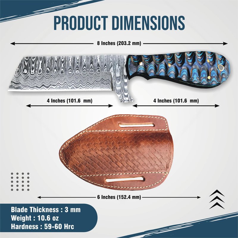 - [8" DAMASCUS STEEL KNIFE and LEATHER SHEATH] This Bushcraft Knife is constructed of premium Damascus Steel to help keep the sharpness longer. The sheath for this knife made from leather is equipped with a snap fastener and an elastic strap to fasten the belt securely. The overall Length is 8'' the blade size is 4''. The handle size is 4".