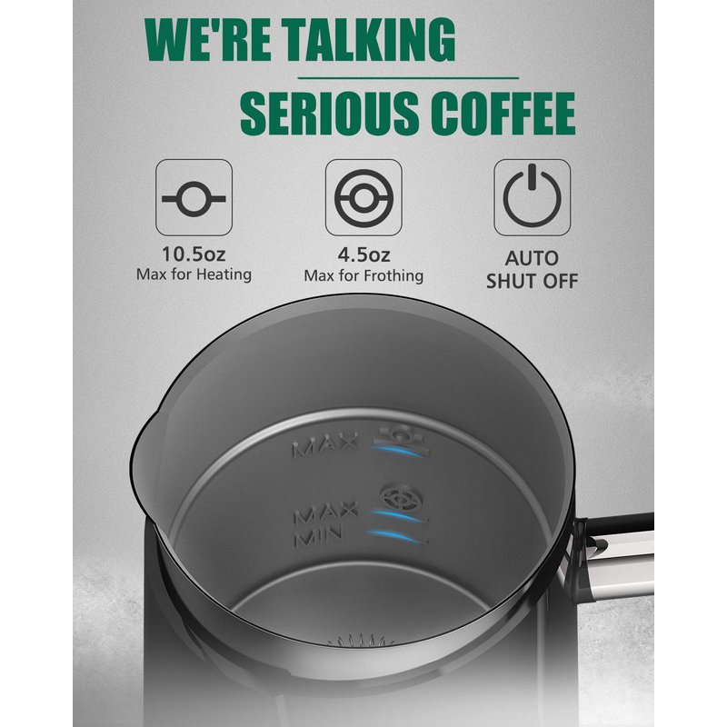 ๐จCreamy Foamy Frother ๐ Huogary automatic electric milk frother guarantees the texture and original flavor of foam and steamed milk, allowing you to indulge in cafe-style cappuccino, latte, macchiato, etc. ๐จQuick Milk frother ๐ Just press the button, 60~120s can get hot milk and exquisite milk foam. The fully automatic process can be completed in less than two minutes. (if you need richer foam, just repeat the sanding). ๐จThree Styles Milk Foam ๐ According to your different needs, this milk frother can produce milk froth with three different textures, the maximum frothing volume is 4.44oz / 130ml, and 10.5oz / 300ml milk is heated (recommended whole milk (fat content> 3%)) get better results). ๐ Easy To Clean ๐ The milk frother and steamer adopt modern and fashionable design, equipped with double-layer vacuum insulation wall, high-quality stainless steel and non-stick coating interior, which can realize convenient cleaning and longevity.โค(Do not turn the milk frother upside down after cleaning). โ Safety and Reliability ๐ With UL certification and Strix temperature control, this milk frother can automatically switch off when your milk or froth is ready, to prevent burning or over-frothed, ensuring safe use.(Voltage: 120V )