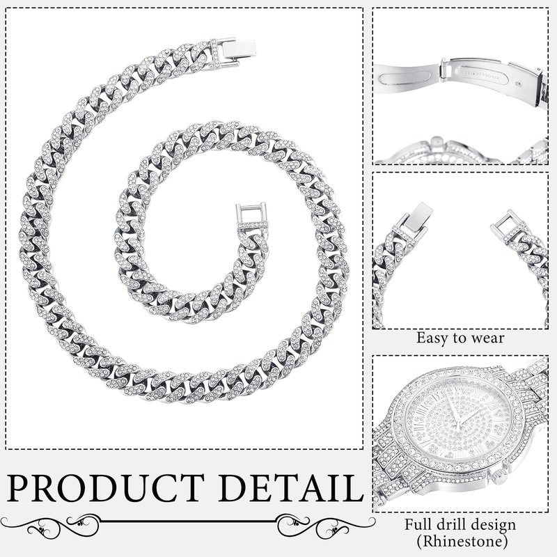 - Elegant and Quality Material: featuring an exquisite blend of alloy and rhinestones, this hip hop chains for men oozes elegance, the use of these materials ensures durability and ensures that the jewelry pieces will retain their charm for a long time, not easy to break or fade; Elevate your style and stand out with this stunning ensemble