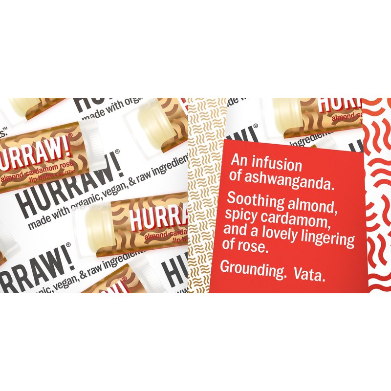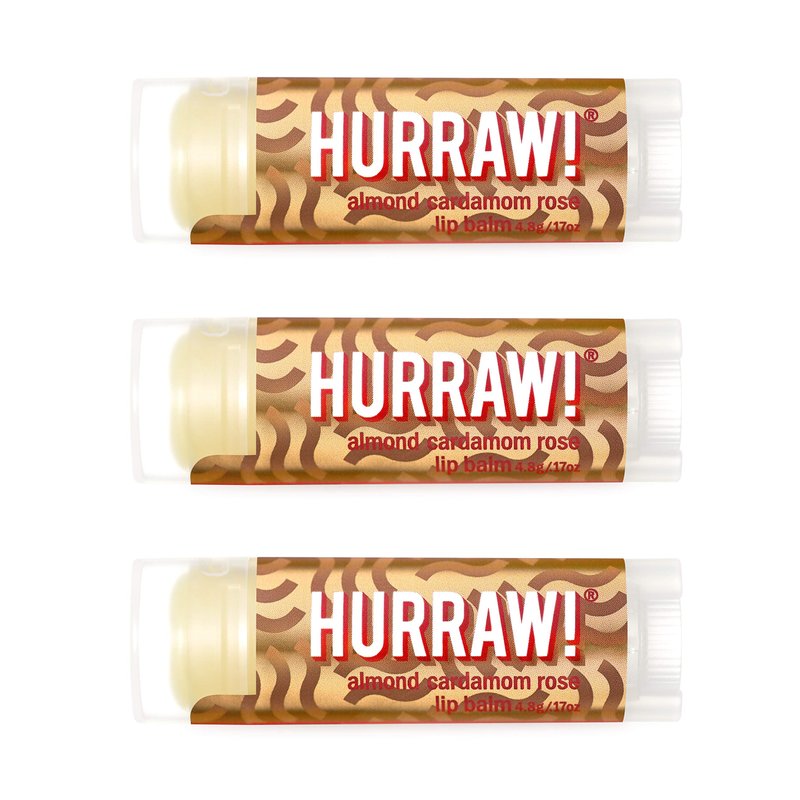 • THREE 4.8g/.17oz Oval Tubes of Almond Cardamon Rose (Vata) Lip Balm packaged in a white HURRAW! branded pillow box. The soothing almond scent is complimented with notes of spicy Guatemalan cardamom and finished off with a lovely lingering of Turkish rose. Grounding. Made with certified organic, vegan, and raw ingredients. Hurraw! Lip Balms are certified 100% all natural origin, cruelty & gluten free. Non-GMO. Bee, Shea, Soy & Palm Free.