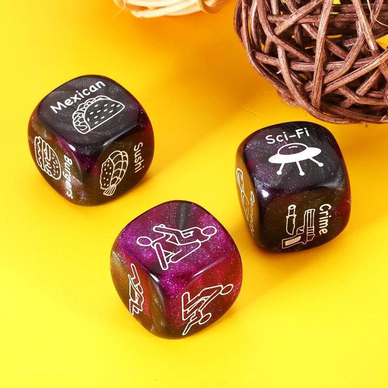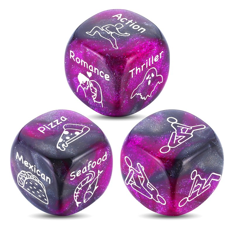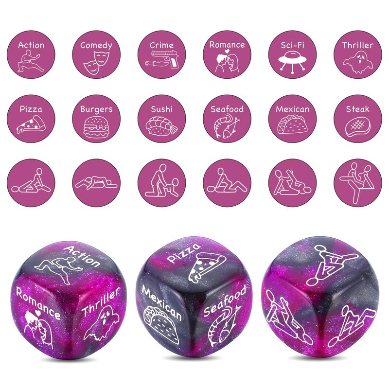 - Valentines day gift for him--Roll the dice to decide what to eat at date night, each choice and combination is mysterious. Food dice engraved with"Pizza,Burgers,Sushi,Seafood,Mexican,Steak”. Movie dice engraved with”Action, Comedy, Crime, Romance, Sci-Fi, Thriller”. Love dice engraved with six posture.These dice give you more options. Every choice in eating, playing and spending the night was so romantic. Unique love gifts, funny couple gift.