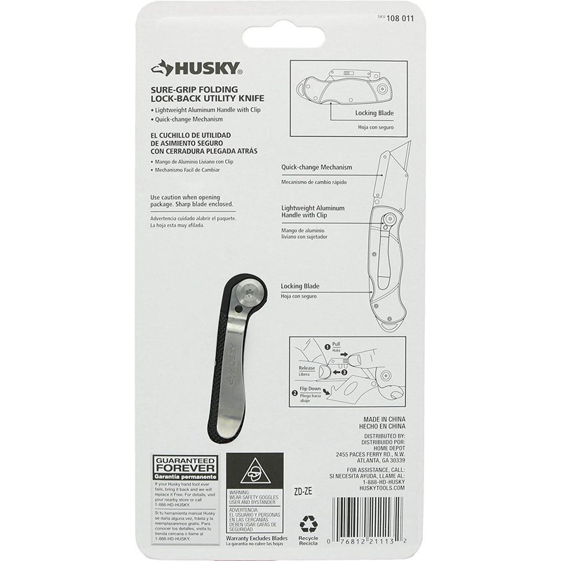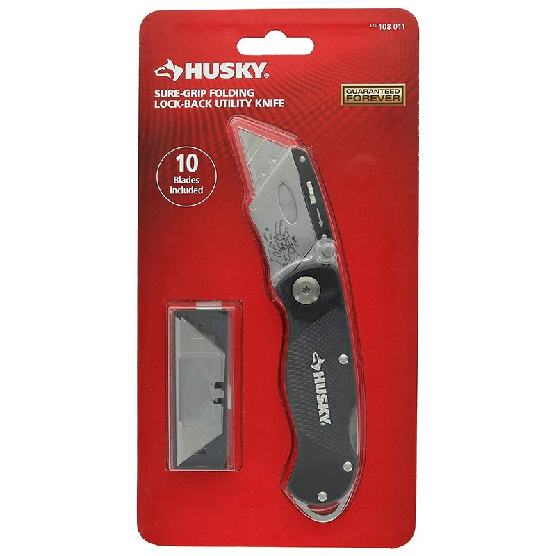 Husky 21113 Folding Sure-Grip Lock Back Utility Knife w/ 10 Disposable Blades Included (Colors Vary)