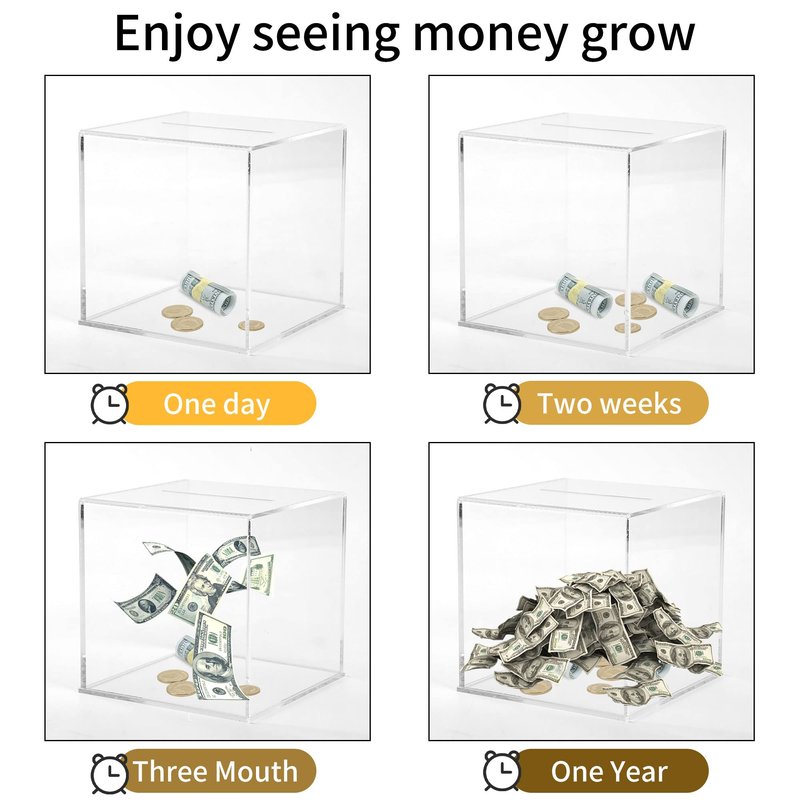 Buying your kids a piggy bank is a great way to teach them the value of money and the importance of saving. Acrylic piggy bank is a good tool for storing coins and banknotes, and it is also a good helper for children to establish money-saving awareness. Older children can benefit from being encouraged to learn how to save money for years to come and can instill in them an important concept that will last a lifetime.