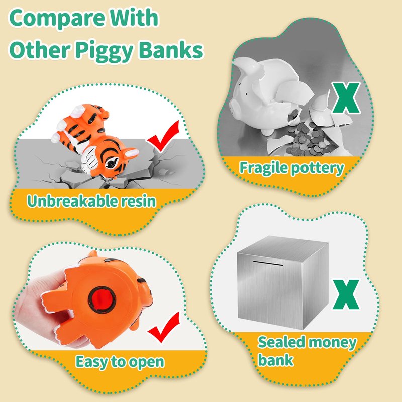 - 【MY FIRSR TIGER BANK】: A starter bank for young toddlers, start the saving process by adding cash to this cute tiger piggy bank. The tiger money box looks cute and attractive, kids will love placing money in this adorable coin bank friend and watching their savings grow, which also helps develop kids' good habits of saving money.