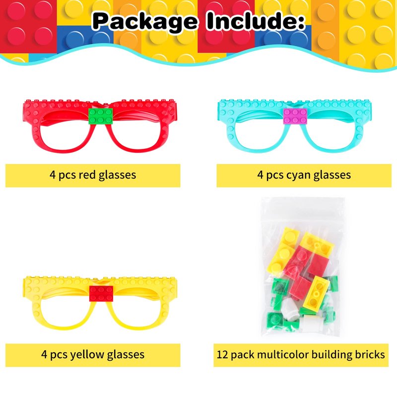 - Building Bricks Glasses Set Includes: 12pcs glasses frame of various colors, 4 yellow, 4 red and 4 cyan, and 12 packets of colored building bricks, interesting and unique design of glasses are very popular with kids.