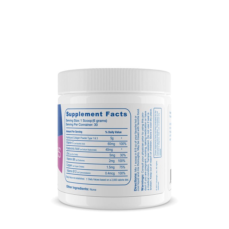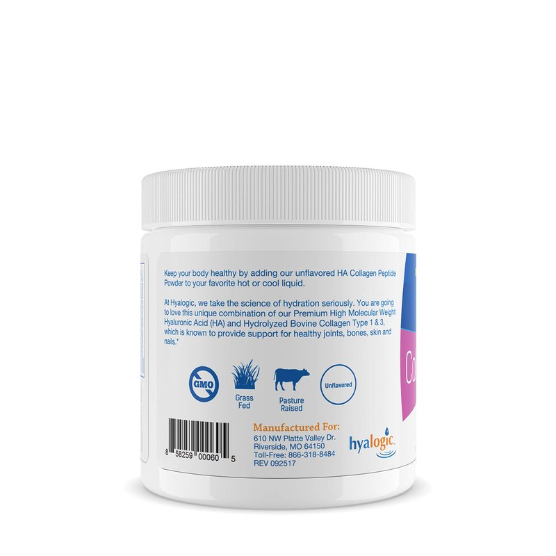 Keep your body healthy by adding our unflavored HA Collagen Peptide Powder to your favorite hot or cool liquid. At Hyalogic, we take the science of hydration seriously. You are going to love this unique combination of our Premium High Molecular Weight Hyaluronic Acid (HA) and Hydrolyzed Bovine Collagen Type 1 & 3, which is known to provide benefits for healthy joints, bones, skin and nails.* Non GMO, Grass Fed, Unflavored and Pasture Raised Bovine Type 1 & 3. Directions Mix 1 scoop in 8 fl oz of your favorite hot or cool liquid and mix thoroughly. May also be mixed or sprinkled on your favorite foods. Consult your physician prior to using this product if you are pregnant, nursing, taking medication or have a medical condition. Tamper resistant. Do not use if seal is broken. Keep out of reach of children. Store in cool dry place.