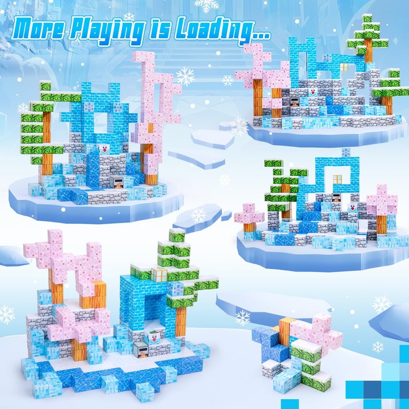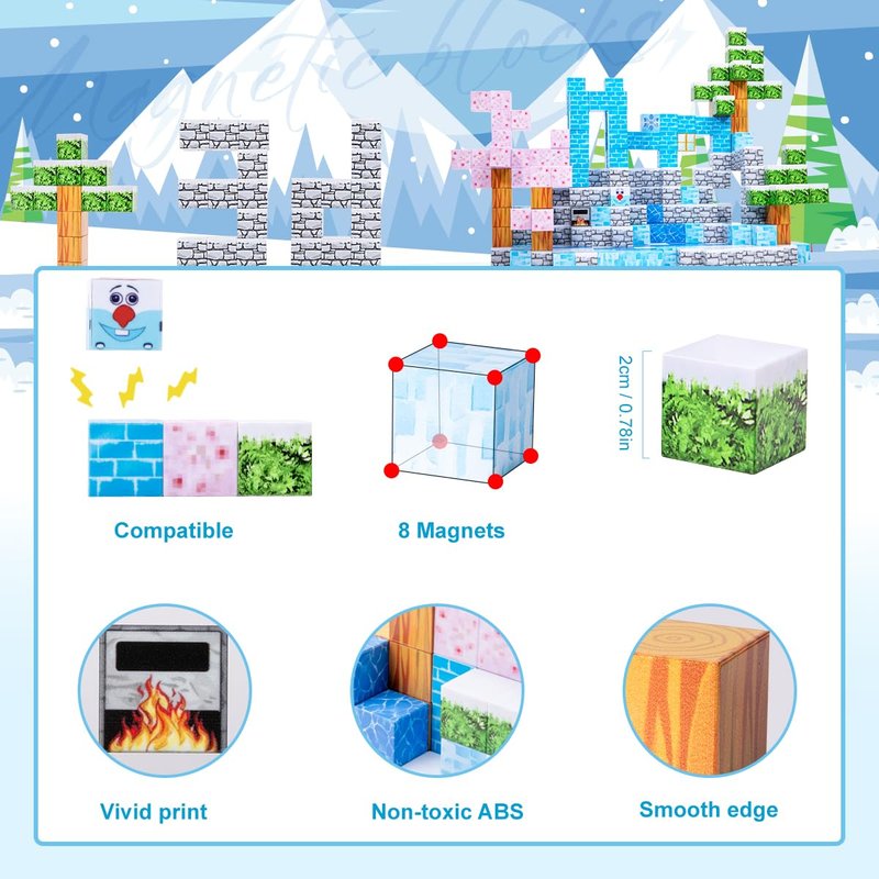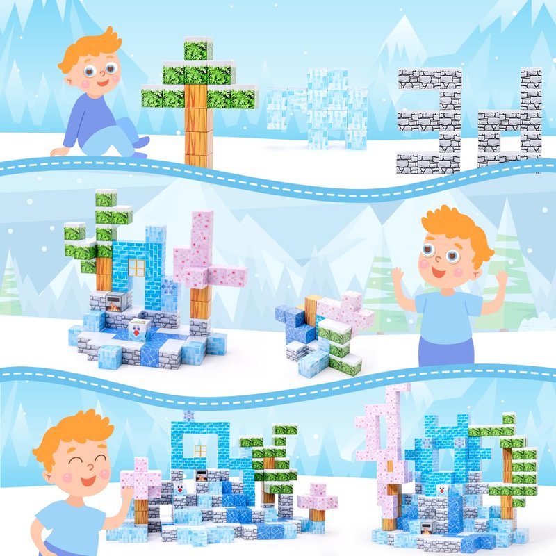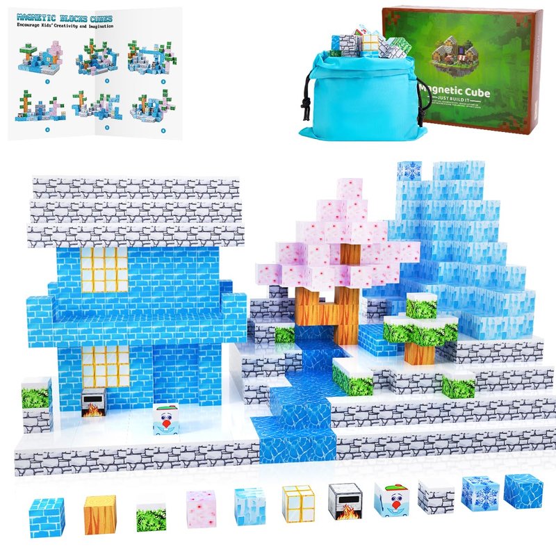 - 12 Patterns of Magnetic Constructing A Snow world Full of "Vibrant" & "Attraction". Comprising blossom*9, grey marble*34, leaf*10, blue brick*8, snowman*1 , etc. We offer 6 examples as the opening of kid's fantastic ideas. Abundant quantities and style to assist kids creating more shape and structures, like house, castle, tree, and a world of their own, which get kids excited by finding a new way of playing everyday.