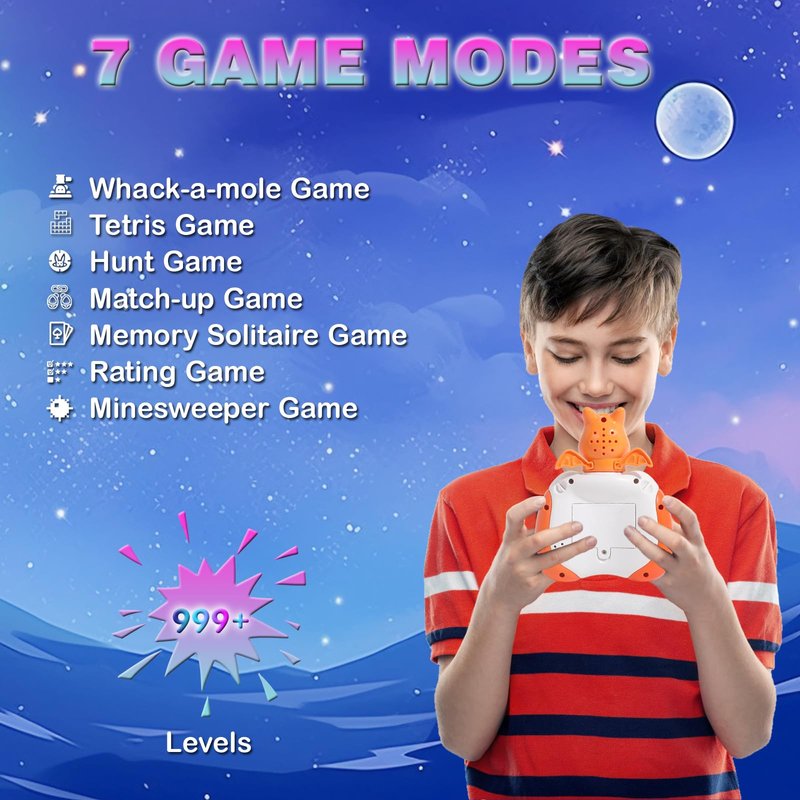 - 7 Game Modes : - New upgrade adds directional joystick with 7 game modes (Whack-a-mole Game, Tetris Game, Hunt Game, Match-up Game, Memory Solitaire Game, Rating Game, Minesweeper Game), more interesting and diverse gameplay. Let your kids think positively and react quickly in challenging levels and exercise concentration, memory, reaction, hand-eye coordination and hands-on ability. *For more detailed gameplay, please refer to the provided manual.