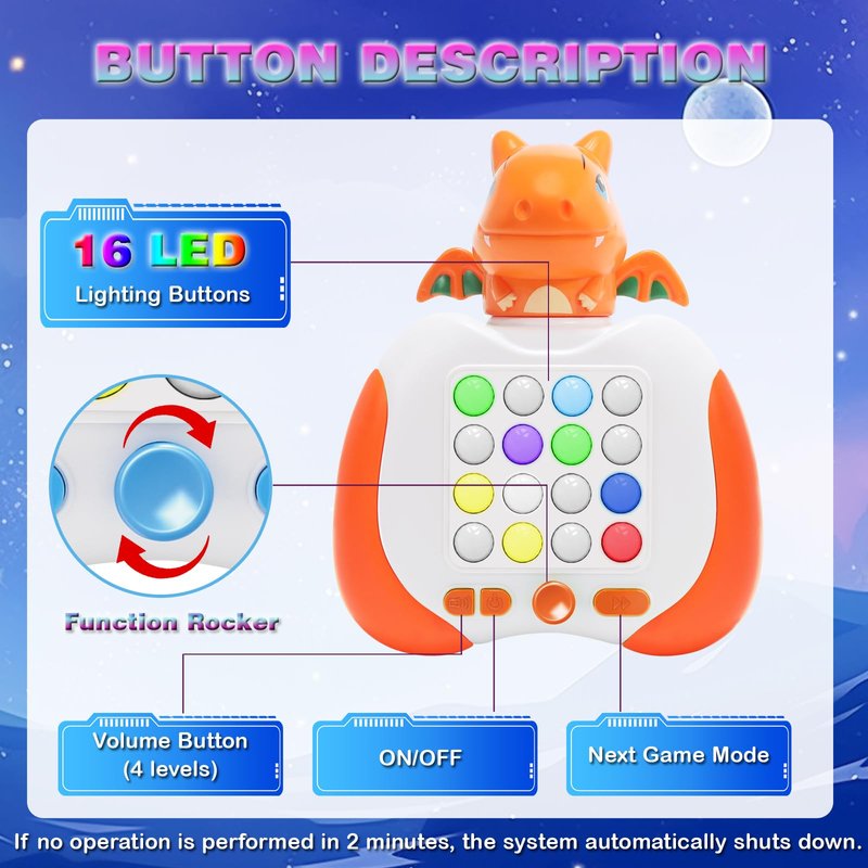 - Safe Material : - Made of high-quality ABS with rounded corners, the pop game is not easy to break and safe for children. If no operation is performed in 2 minutes, the system automatically shuts down.
