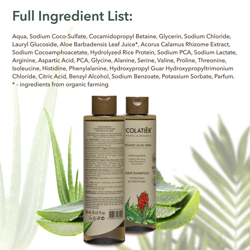 Hydrating & Strengthening Hair Shampoo with Organic Aloe Vera ECOLATIER, 250ml - 97.5% Natural, Vegan - Rice Proteins & Sweet Flag for Moisturized Hair - 8.5 Fl Oz