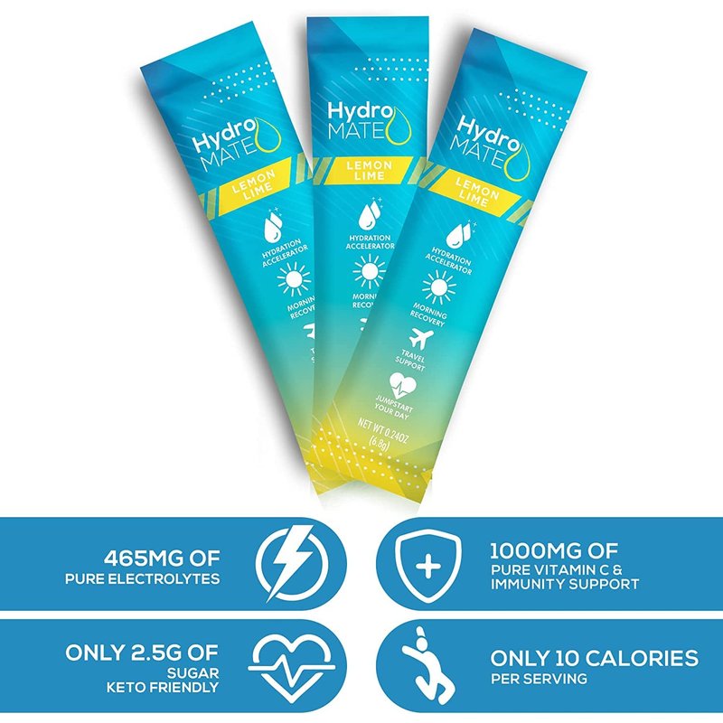 HydroMATE Electrolytes Powder - 30 Count Instant Lemon Lime Hydration Packets with Vitamin C to Boost Energy - Low Calorie Electrolyte Packets Support Hydration for Fast Party and Dehydration Relief