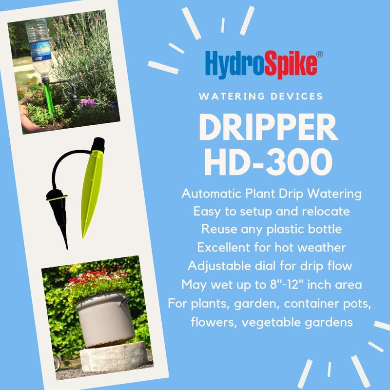HydroSpike Dripper is a portable and deep watering solution for outdoor and container gardens. Adjust for your plant’s water needs by simply setting the dial to just the right amount of water for your garden plants and vegetables. Recycle your plastic bottle and use as the water container on our HydroSpike Dripper. Our dripper requires no hose, provides deeper watering for better growing, and is an excellent portable solution in very hot weather. But this is not recommended for vacation use. Authentic HydroSpike Dripper product comes with the HydroSpike logo, design and printed packaging box.