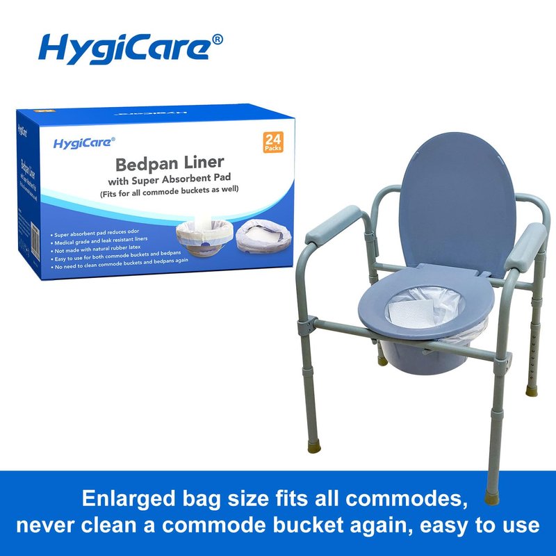 HygiCare Bedpan Liners with Super Absorbent Pads - 24 Count Universal Fit, Medical Grade, Leakproof, Odor Reducing, For Bedside Commodes