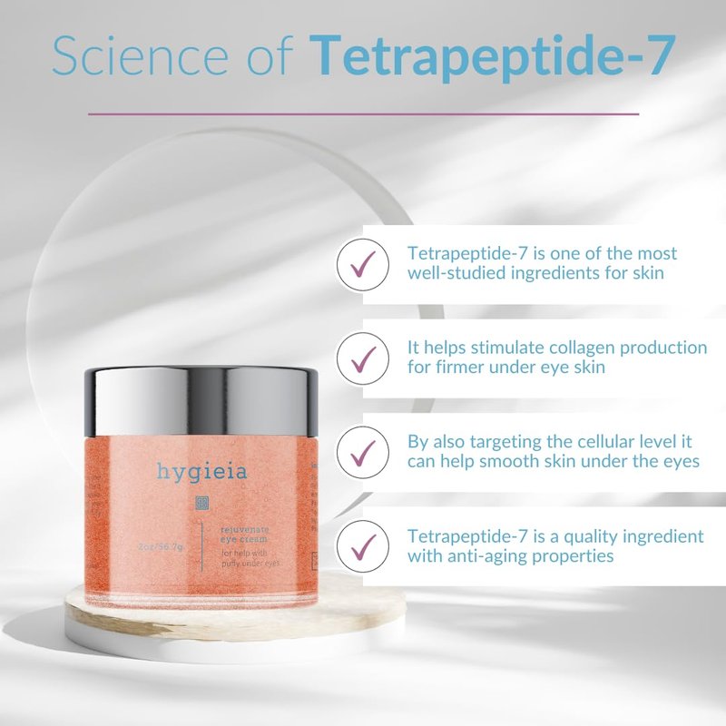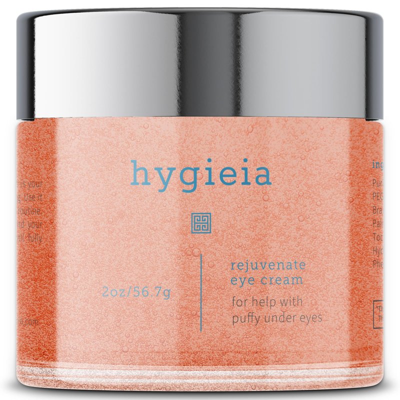 HYGIEIA EYE RESTORE CREAM: Refresh and revitalize tired, puffy eyes with a fast-acting peptide eye cream for agge circles, puffiness and under eye bags. This intense eye firming treatment restores vibrancy to the delicate eye area, smoothing and reviving for a more youthful complexion. Our under eye treatment is a synergistic formulation of clinically-proven ingredients in a high quality anti-aging cream for puffiness and bags under eyes. Hydrolyzed Rice Bran Protein and Glycine Soja Protein soothe and calm, while Ceramide NG and Coconut Oil deeply nourish and hydrate. Peptides and Hydrolyzed Collagen help reduce the appearance of under eye wrinkles, and Vitamins A and E protect the skin’s natural barrier and support renewal. Finally, Alpha Arbutin and Hyaluronic Acid help combat age circles under eyes, and flood skin with moisture for a plump and radiant finish. Our eye repair cream features an exclusive formula with high-quality ingredients like Argireline NP, Vitamin A Palmitate for anti-aging benefits, plant-based collagen to reduce wrinkles, and Propylene Glycol for moisture retention.Formulated without parabens or sulfates, our cruelty free eye repair and restore cream is made in the USA. This fast absorbing eye treatment cream should be applied under each eye and rubbed in thoroughly, up to 3 times per day, as tolerated. Apply to clean skin, and avoid direct eye contact. Hygieia combines technology with natural ingredients to create cutting edge anti-aging skin care products that protect, nourish and reveal the radiance of healthy skin. Our brand is inspired by Hygieia, the goddess of health, strength, supernatural beauty and eternal life, and our mission is to help keep skin looking vibrant and youthful at every age.