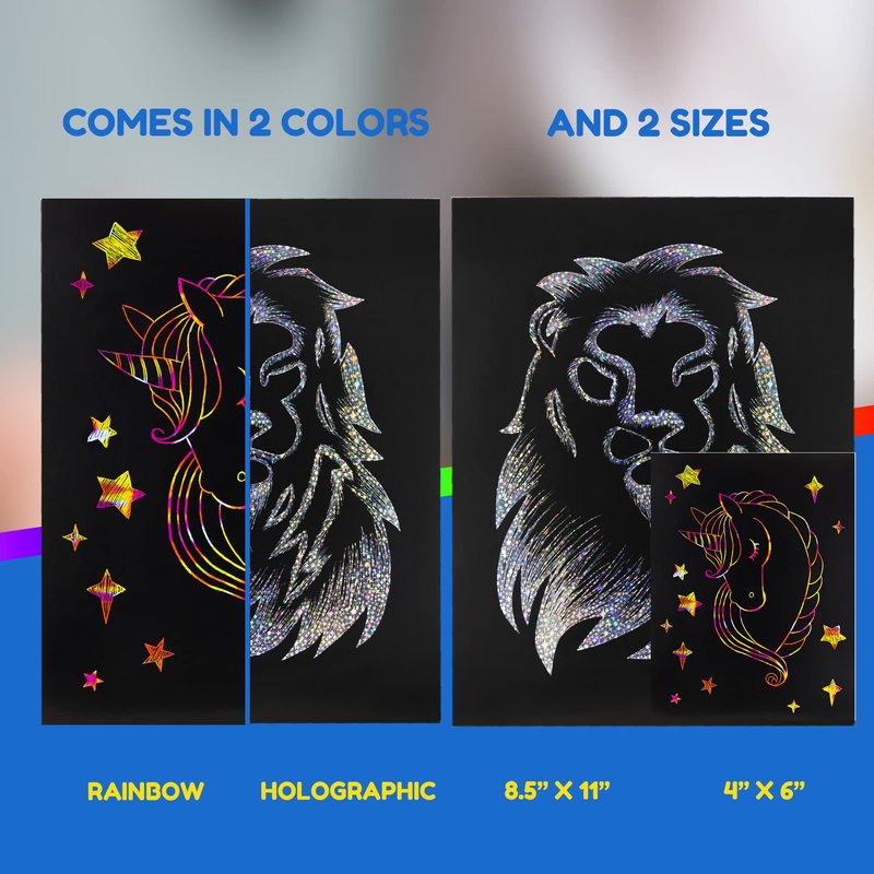 - DURABLE & HIGH-QUALITY SCRATCH OFF PAPER - These scratch silver holographic art sheets are long-lasting and high quality and measure 4”x6”. Each scratch paper is safe to use, non-toxic and fast to clean up. Easily dry wipe the black residue resulting from scratching and the arts and crafts are good to go!