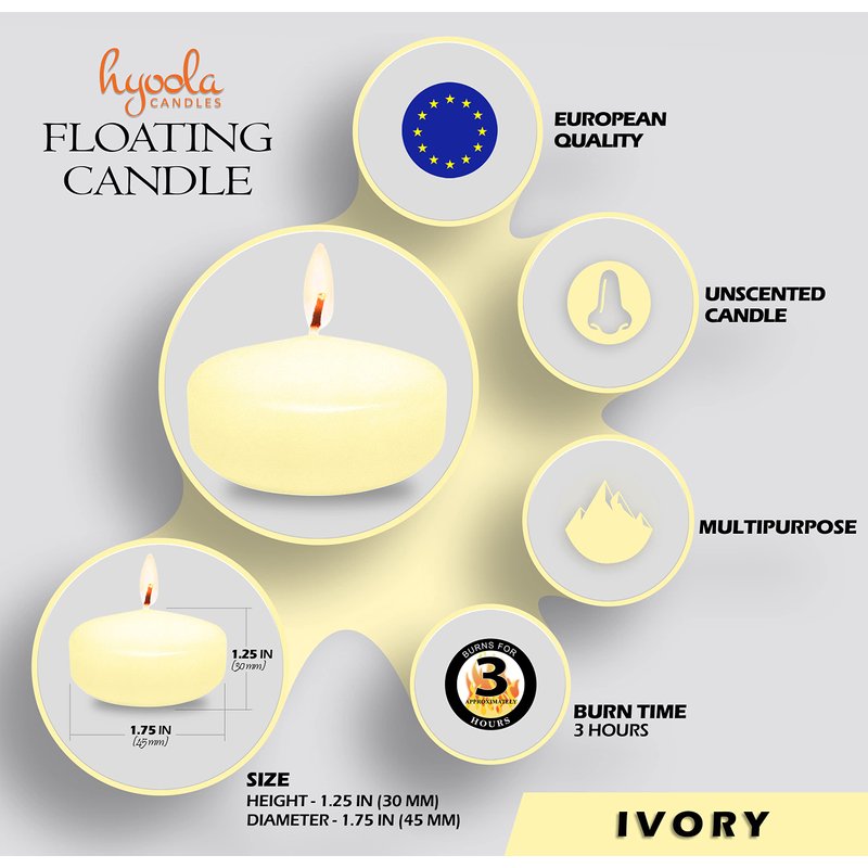 HYOOLA Premium Ivory Floating Candles 1.75 Inch - 3 Hour - 20 Pack - European Made