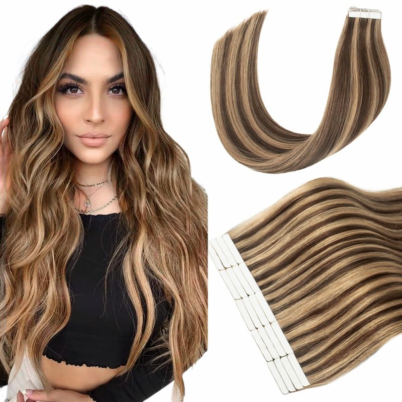 Hyssiet Invisible Tape In Hair Extensions Human Hair Chocolate Brown Highlighted Caramel Blonde 14Inch Remy Soft Seamless Double Side 20Pcs 50G Tape Cabello Humano Extensiones