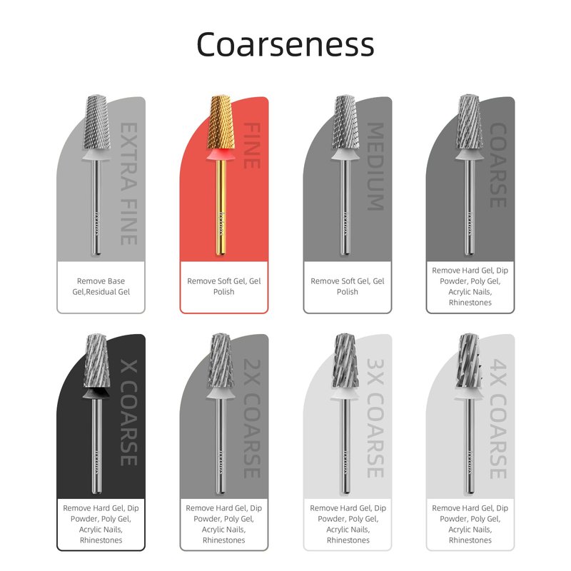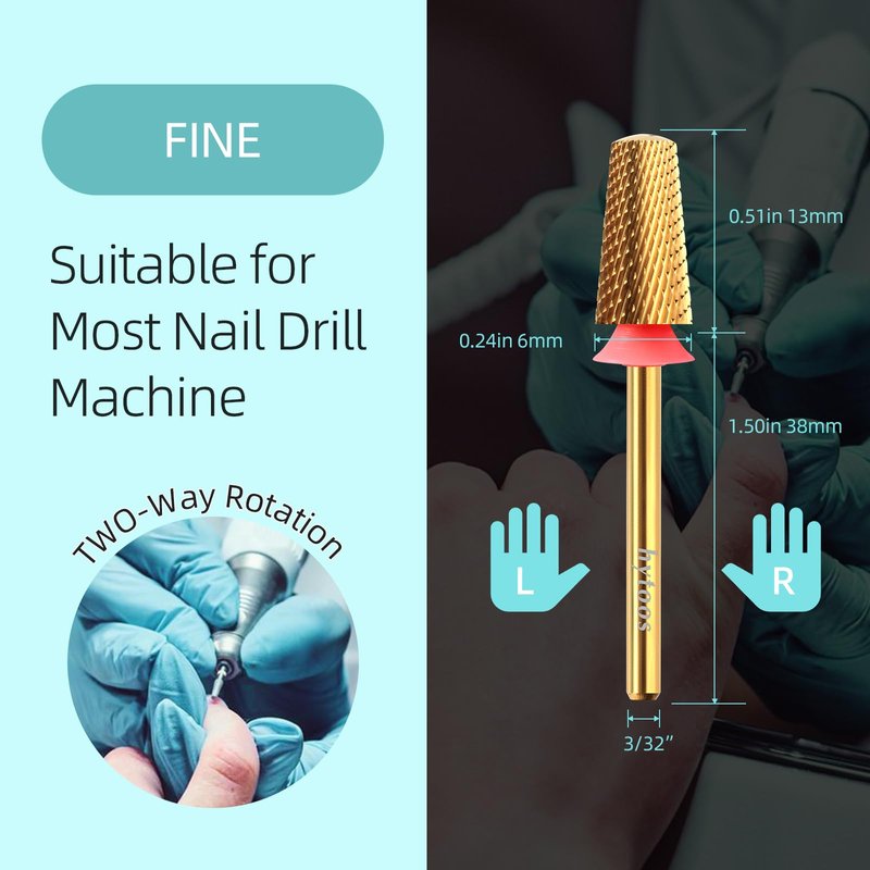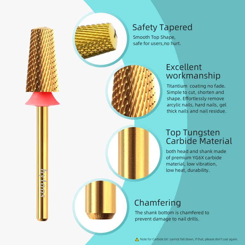 Professional hytoos Safety tapered nail drill bit, round top designsafe for users, sharp cross cut teeth (XF, F, M, C, XC, 2XC, 3XC, 4XC) for hard gel, nail polish, polygel, dip powder, acrylic nails, natural nails and artificial nails, meeting your different needs for nail art design, also allowing for two-way rotation and supporting both left and right-handed operation, these nail drill bits are suitable for most electric nail drill machines on the market. And the titanium coating makes the bits durable and long life, more wear-resistant, non-slip and easier to clean.