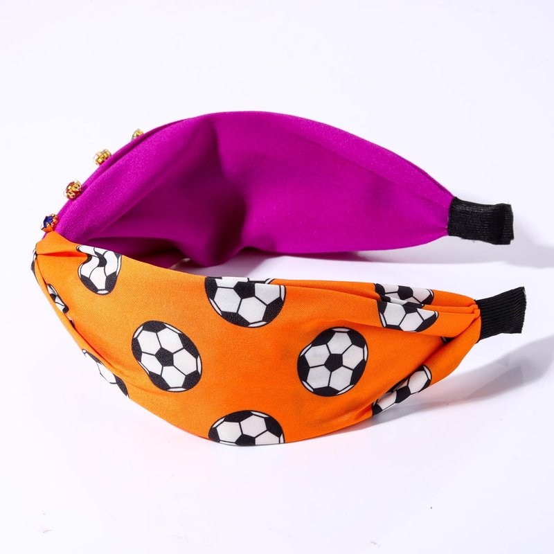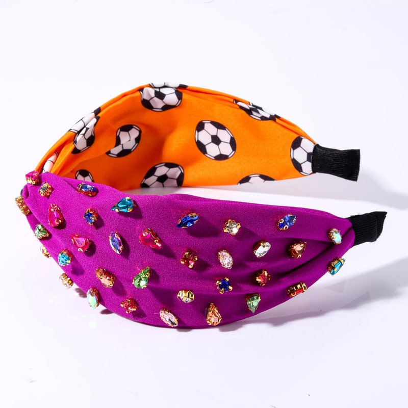 - Accessorize your game day outfit with the game day multi stone embellished football patterned twisted headband! This game day headband features two toned purple and orange fabric, a twisted knot detail on top, hand-sewn multicolor crystal stone and soccer football patterned,Show your team pride with a touch of pizzazz!