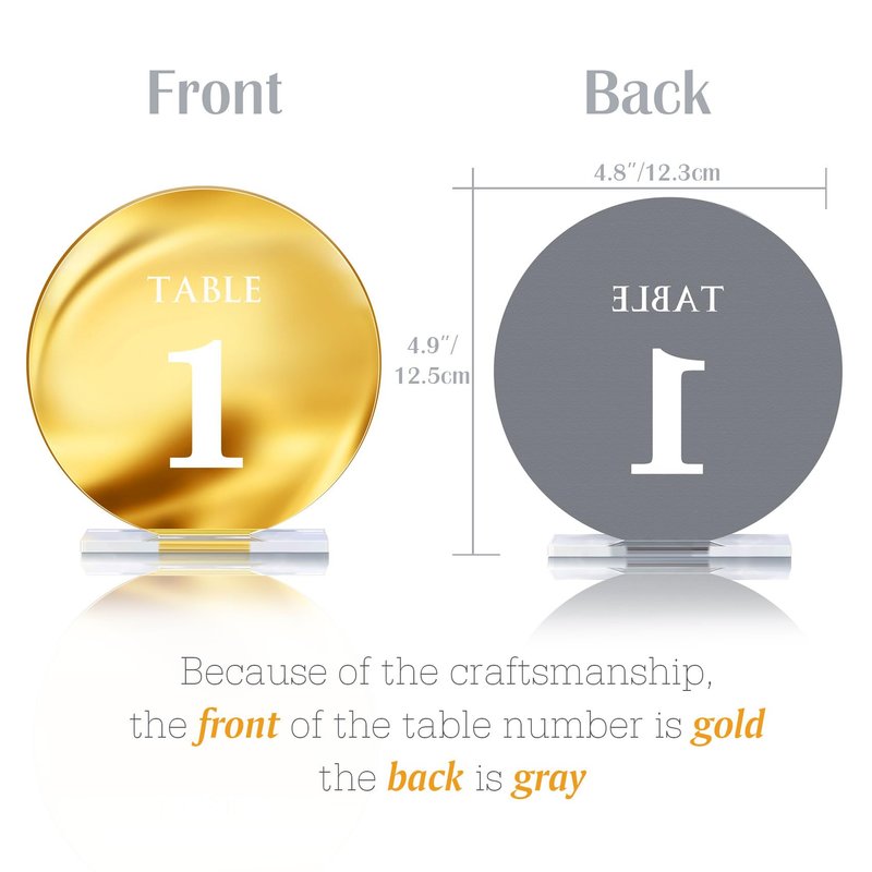 - 【Modern and Simple Mirror Table Numbers】These modern round acrylic table number sign are the perfect reception to add to your wedding. These mirror acrylic signs are a beautiful wedding table centerpieces decorations, perfect for displaying on Tabletop Centerpiece.Unlike other wedding table numbers, the surface of ours like a mirror, with a gold color on the front side and a gray color on the back, sure to catch your guests' attention and compliments, making your wedding decorations more unique.