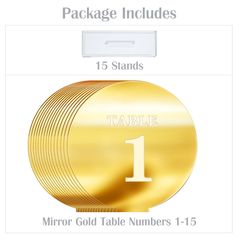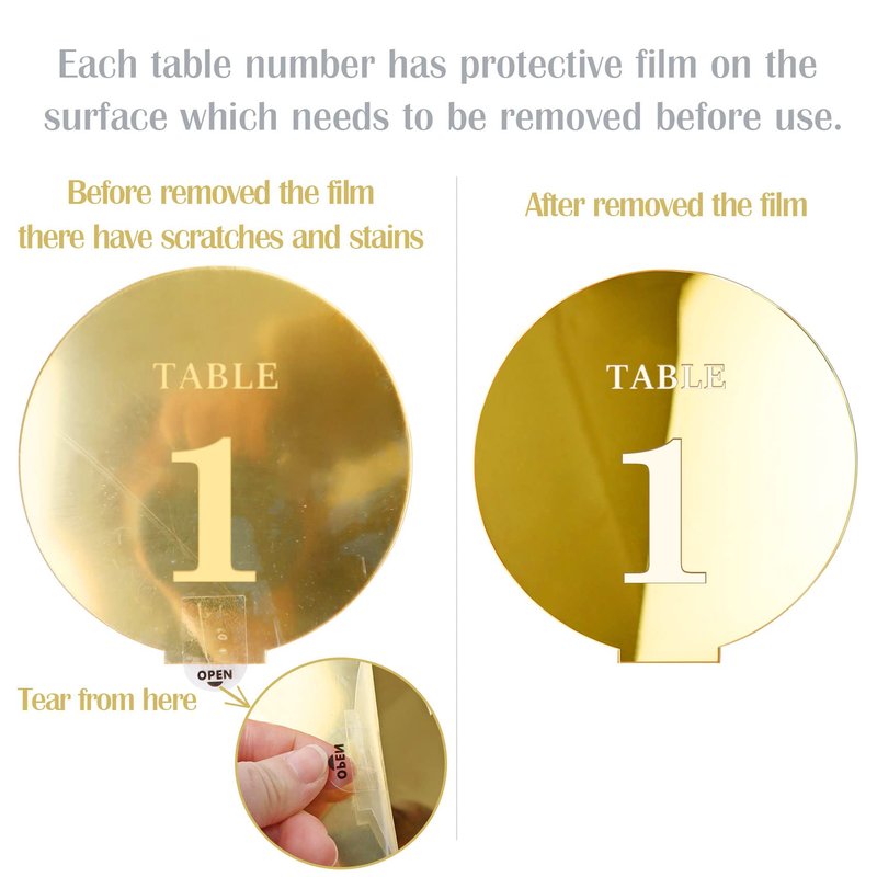 - 【Package Includes】1-15 Laser engraved table numbers in mirror gold with clear stands, 4.8 x 4.9 inch each,1.65mm thick. Total 15 sets in one pack.Please make sure removing the transparent film before using.because there are transparent films on the front of numbers,the both sides of the bases have transparent films to protect the table numbers for wedding reception; else you may cause the break and they will become smooth and clear after being removed films.