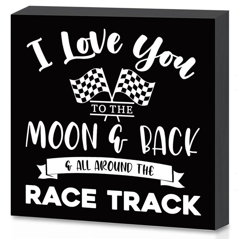I Love You To The Moon And Back And All Around The Race Track Desk Decor Wooden Block Sign Racing Checkered Flags Decor, Wall Art Sign Boys Room Shelf Table Decor(6×6 Inch)