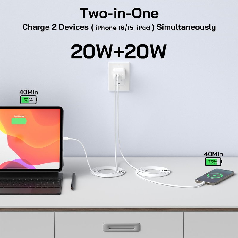 - 20W Dual i Phone 16 15 Charger Fast Charging: Equipped with 2 independent PD 3.0 High Speed USB-C charging port (20W+20W), allow you to fast charge two of your USB-C devices like i Phone 16 15 series and i Pad at the same time. The i Phone 16 15 charger block provides Max 20 watt output power, which can fast charge new i Phone 16 Pro Max to 75% in just 40 minutes, full charge i Phone 16 Plus in 1 hour. 3.5X faster than standard dual usb c charger block.