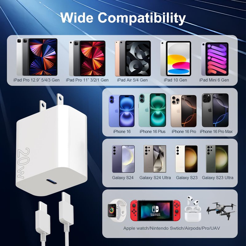 • 【i-Phone 16 15 Charger Universal Compatibility】 The 20W PD phone chargers for i-phone can fast charge i-Phone 16/16 Plus/ 16 Pro/ 16 Pro Max/15/15 Plus/ 15 Pro/ 15 Pro Max,i-Pad Pro 12.9 inch 6th/5th/4th/3rd generation, i-Pad Pro 11 inch 4th/3rd/2nd/1st generation; i-Pad Air 5/4th generation; i-Pad 10th generation, iPad Mini 6.Also compatible with S-amsung Galaxy S24/S23/S22/S21/S20/Note20/Note10/S10/S9/S8 and other USB C phone.