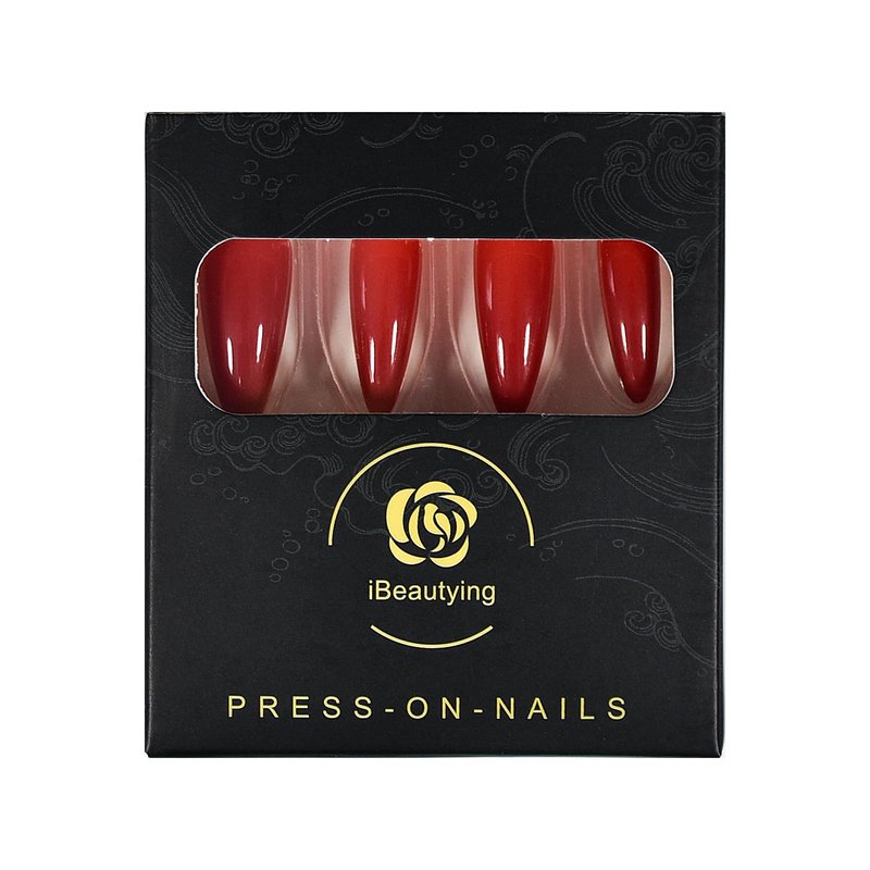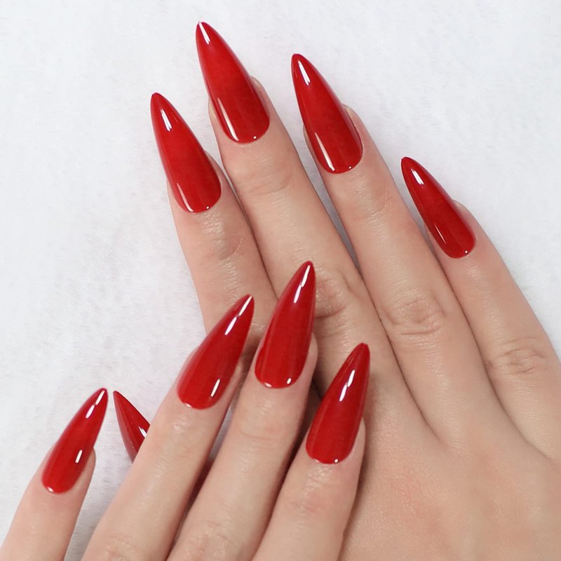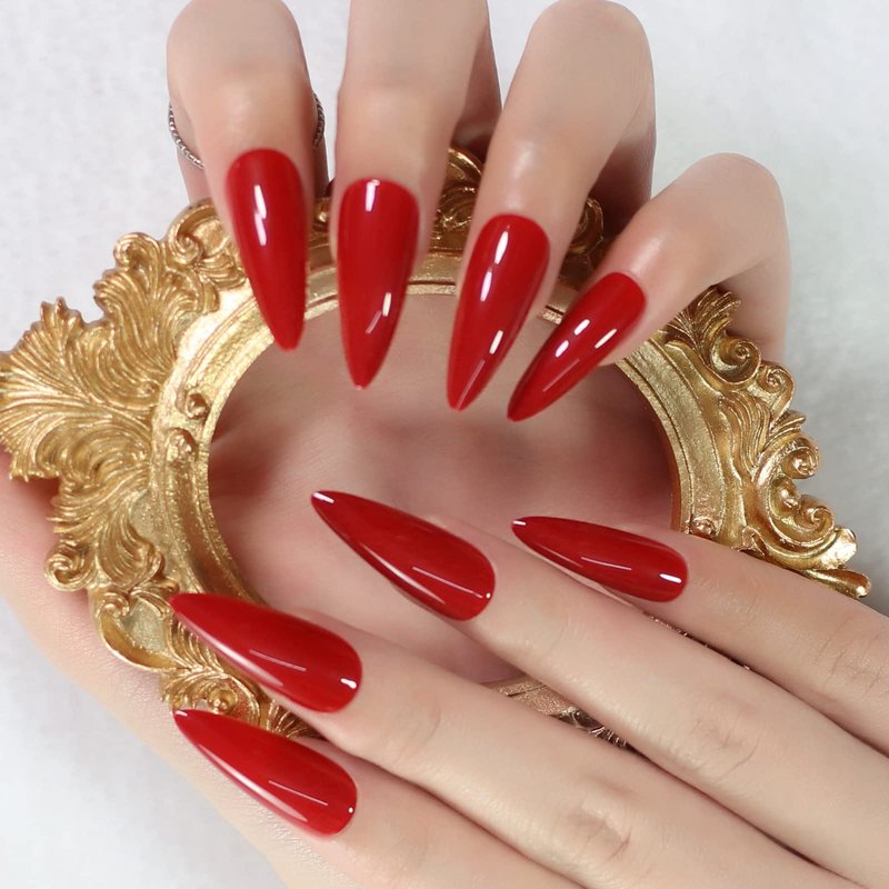 iBeautying Press on Nails - Chinese Red Solid Color False Nails | Stiletto Long Reusable Fake Nails in 10 Sizes - 24 Nail Kit with Jelly Glue Pad