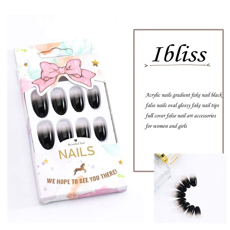 Ibliss Glossy Press on Nails Black Long Full Cover Fake Nails Oval Acrylic False Nails Gradient Nails for Women and Girls 24PCS (Black)