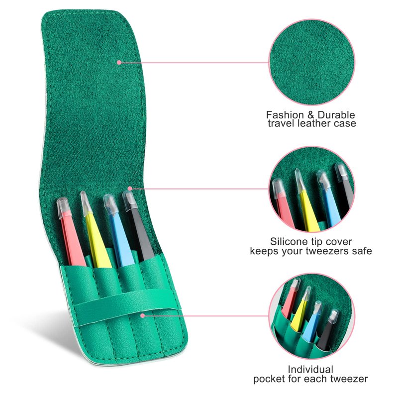 - ★【Travel Leather Case】: The exquisite green leather case perfectly protects the eyebrow tweezers. Each tweezer has an individual pocket to keep eyebrow tweezer clean and not easy to lose, and each eyebrow tweezer has a head protective cover, which protects the eyebrow tips while also protecting us from being scratched by the sharp tips when take out.