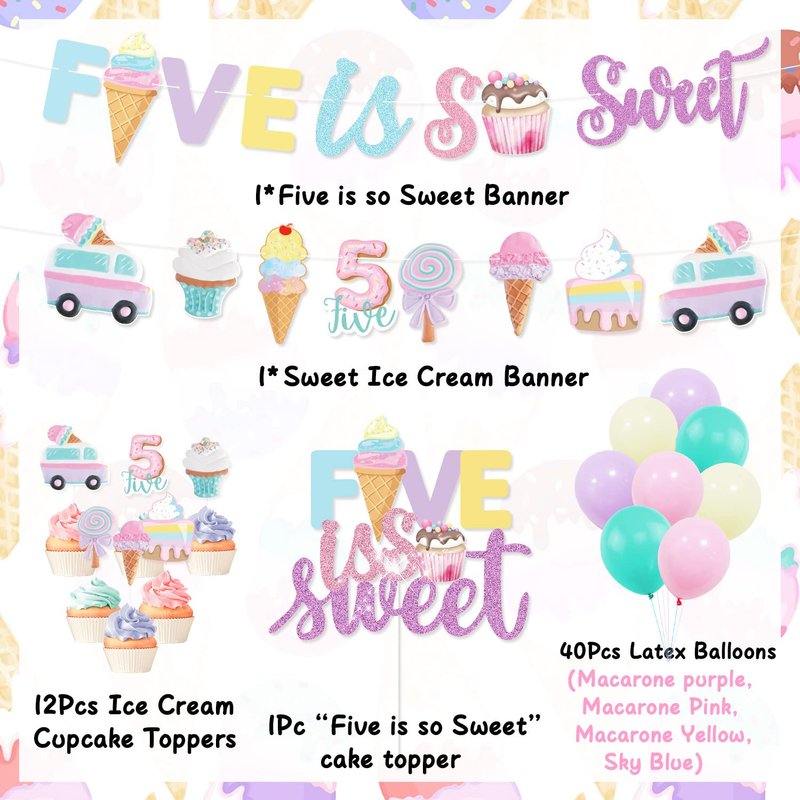 - Pre-Assembled and Easy Decoration - The five is so sweet banner and ice cream banner was already assembrated, save your time when you decorate your party, The glitter four ever sweet cake topper and 12pcs small cupcake topper are pre paste well, No need to assemble, which save your time for use, so you only need to hang it where you want to decorate, outside garden or indoor for a colorful accent