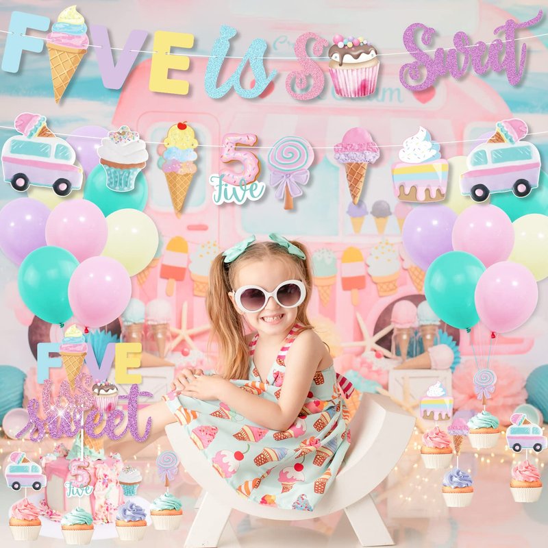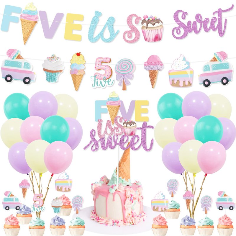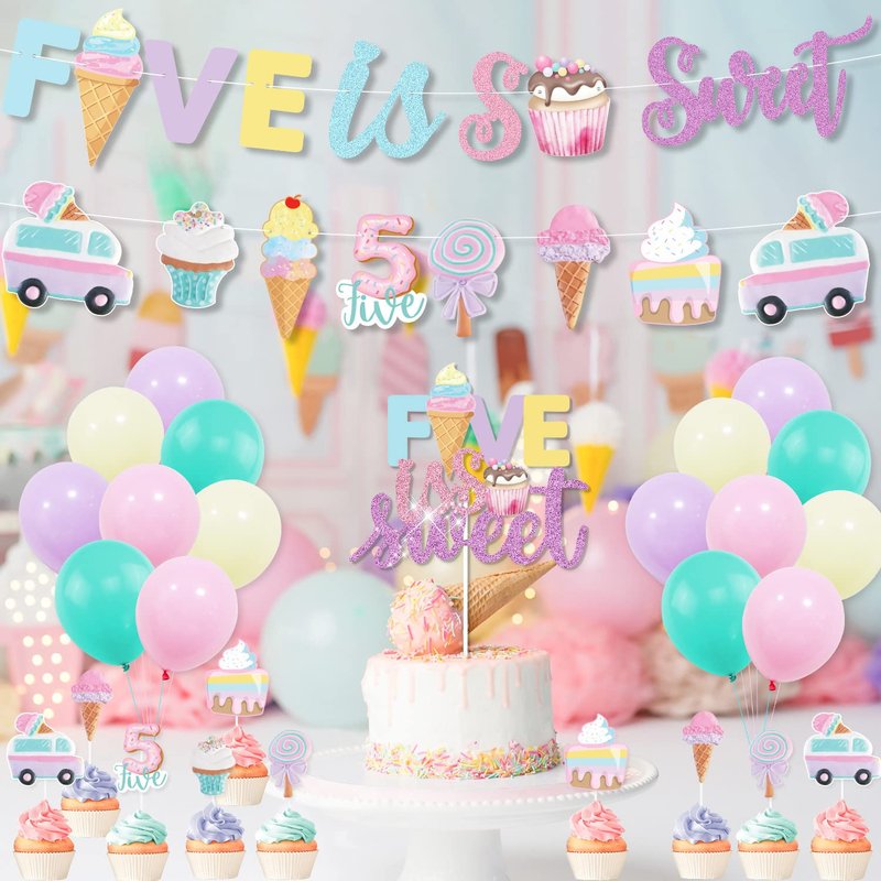 Ice Cream 5th Birthday Party Decorations, Five is So Sweet Party Banner Cake Cupcake Toppers Macaron Balloon for Summer Girls Ice Cream 5th Birthday Sweet Fifth Ice Cream Theme Birthday Party Supplies