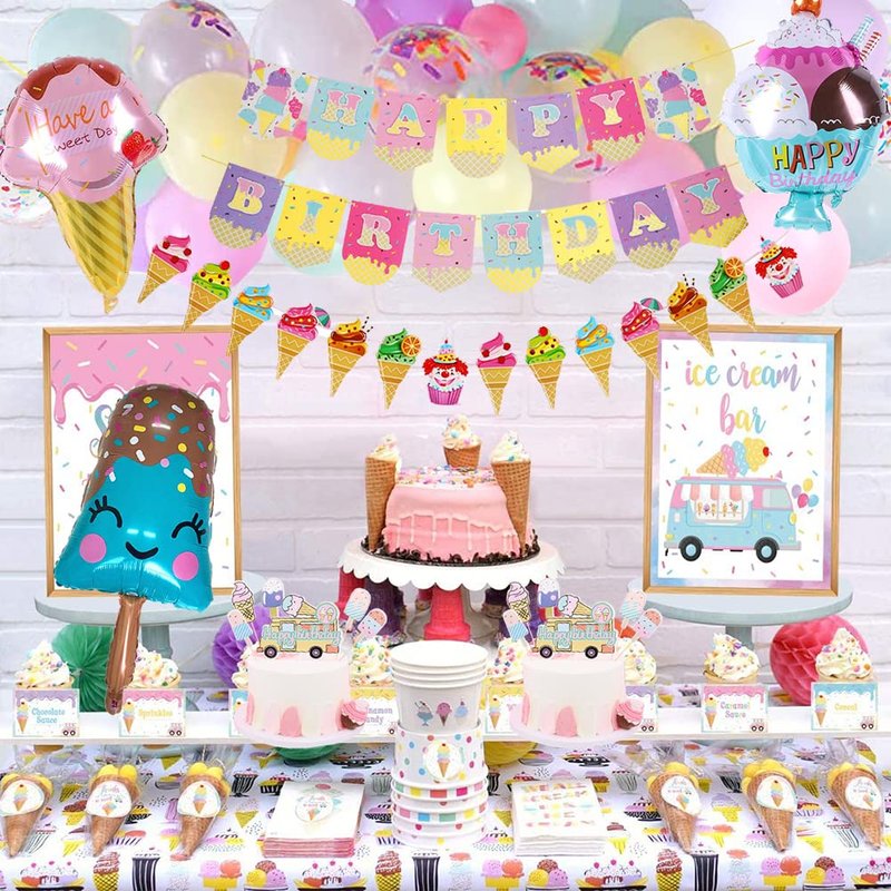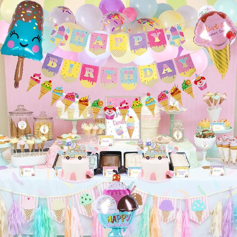 - This sweet ice cream theme party decorations is perfect for ice cream birthday party, girls party decorations, birthday party for kids, popsicle party, pool party, beach party, baby show, Hawaii or any summer event. Decorate the party at home or anywhere as a photo booth backdrop and create lasting memories.