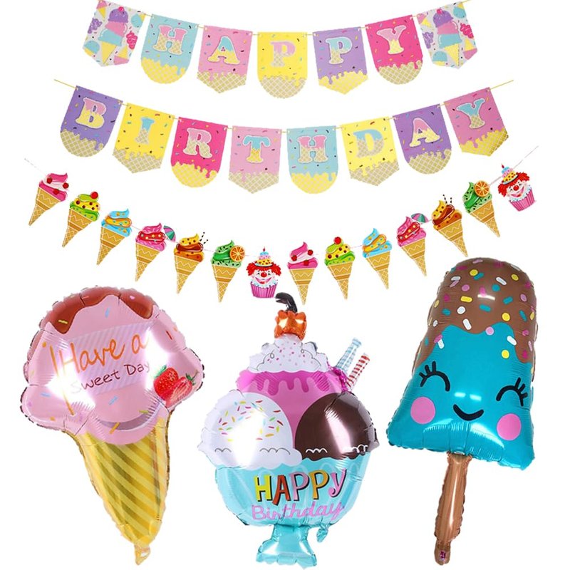 - Sweet Ice Cream Party Decorations: You can get 3pcs large ice cream foil balloons, 1pc happy birthday banner, 1pc ice cream garland. The ice cream theme design, cute and vivid, sweet and dreamlike, shiny and elegant, Macaron color is softer, pastel and attractive and can easily create a sweet and romantic atmosphere at your party, enjoy the ice cream party with friends and families together.