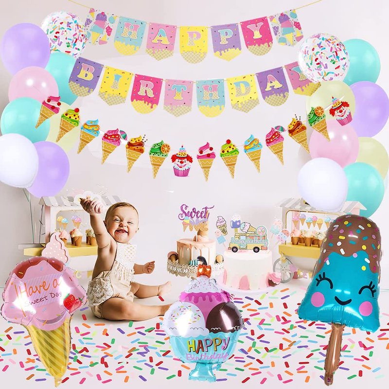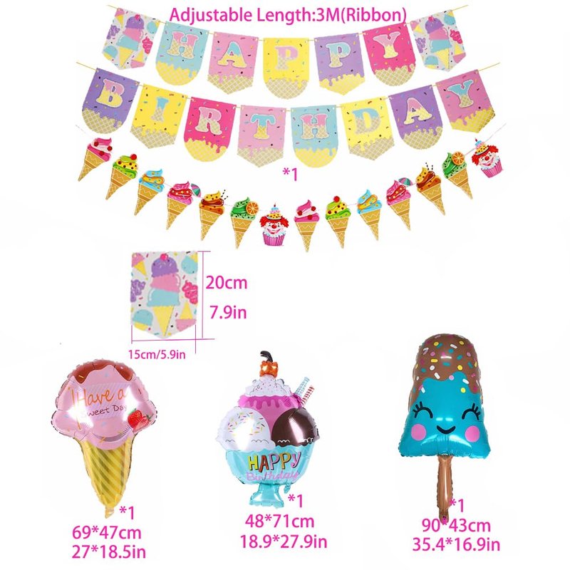 - Unique Ice Cream Design: Cute ice cream balloons, ice cream happy birthday banner, adding a complete fresh looking to your baby's party, it would be a great surprise for her!