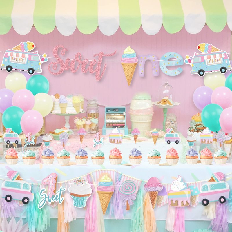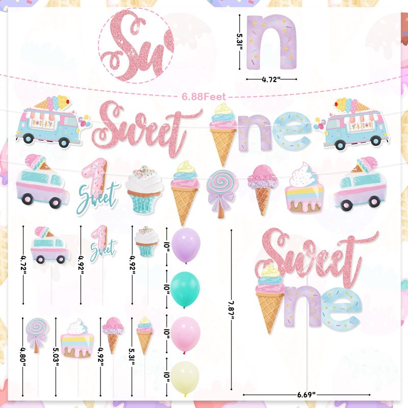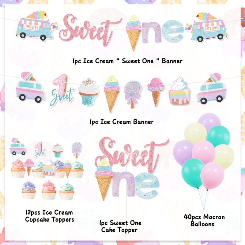 - Sweet One First Birthday Supplies : The multi-colored ice cream party decorations kit comes with 1Pc “Sweet One” banner, 1pc Ice cream banner, 1pc sweet one cake topper, 12pcs ice cream cupcake toppers, 40pcs balloons. All the content of our unique package is made in professional supervision and we are very confident with its quality, durability & stylish effect.