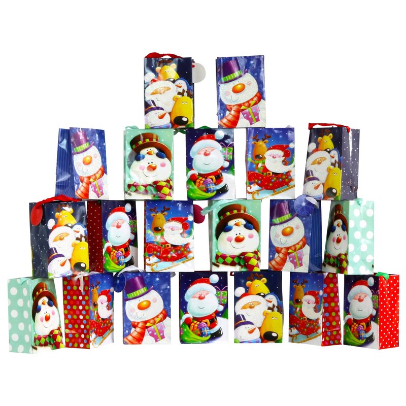 - Beautiful Christmas designs - including snowmen, Santa Claus, and reindeer - on this assortment of bags gives you plenty of gift-giving options