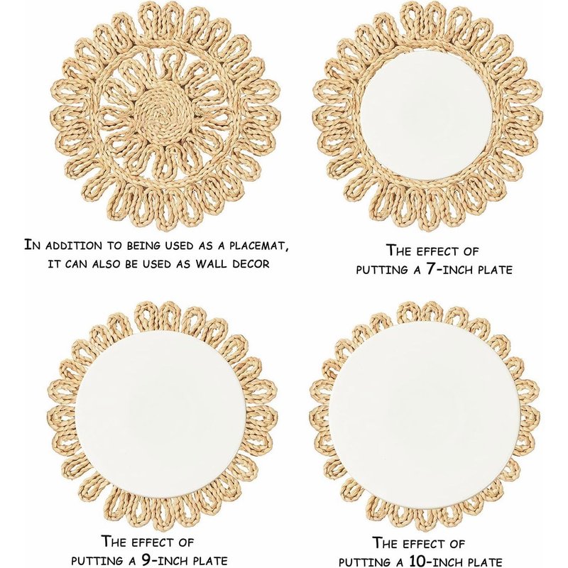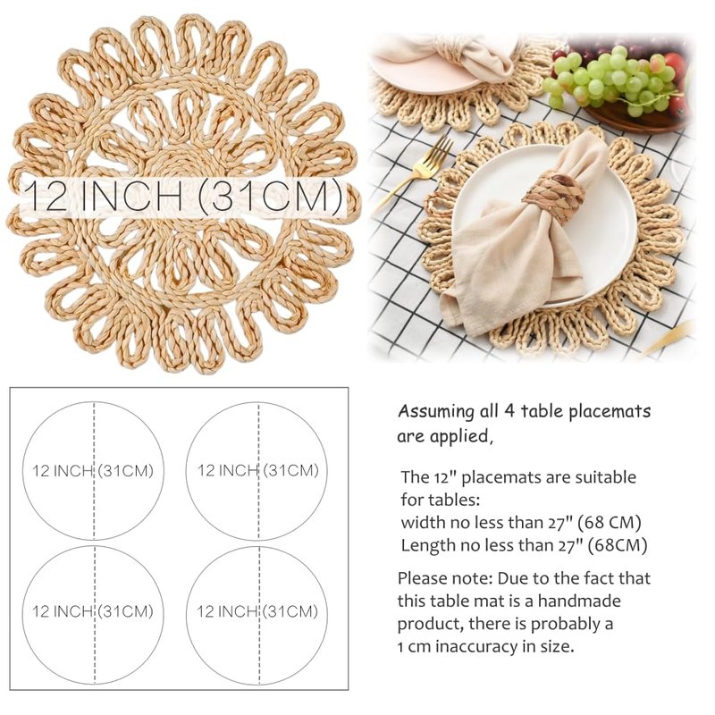 - Natural woven placemats, set of 4, adding a touch of nature and boho style to your dining table.