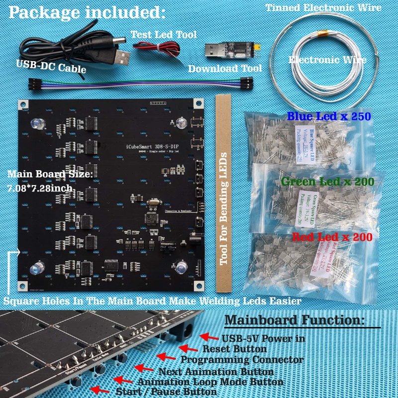 - [LED CUBE KIT] This is a DIY welding package for 3D cube light, a 3D matrix made up of 512 red, green and blue square LED lamps, which can display a lot of colorful dynamic lighting shapes. It is suitable for students' manual electronic manufacturing courses and welding exercises. Meanwhile, it is also a pretty innovative and meaningful small gift. The size of the finished product after welding of this package is about 7.08*7.28*7.88inch, and the distance between the lamps is 0.9inch.