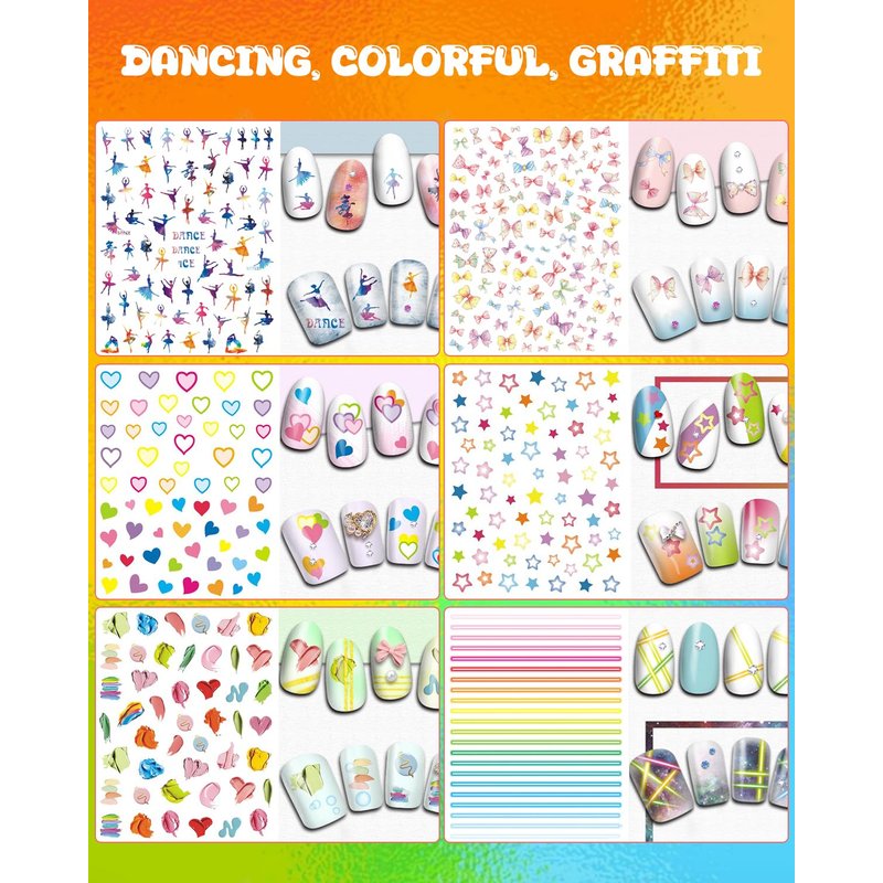 - Cute Design - Bursting with vibrant colors and graffiti-inspired fun offer endless creativity for kids and little girls. There are dozens of designs, and each one is cute and colorful. Featuring Flowers, grass, fruits, butterflies, dancing, bows, stars, and more, unleash your imagination and indulge in DIY nail styling. These stickers guarantee hours of creative fun for kids who love nail art! Children will definitely love it!