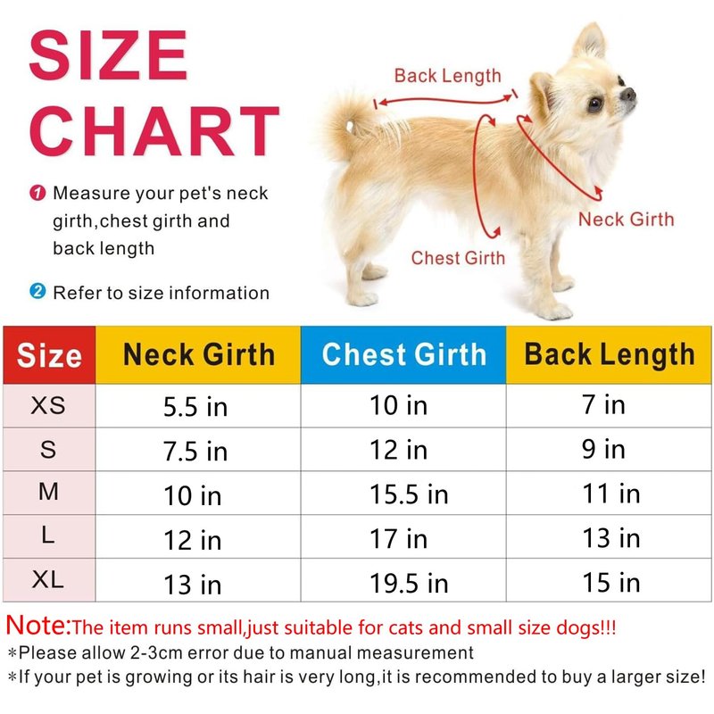 - 【SIZE NOTE】Size S:Chest girth-12 in,Neck girth-7.5 in,Back length-9 in.Please don't choose size according to your usual size.Please measure your pet's Back Length,Chest Girth,and refer to Size Information before you buy.The item runs small,just suitable for cats and small size dogs!!!