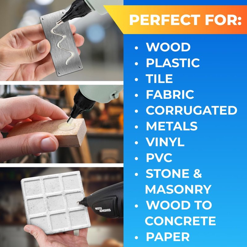 - GLUES EVERYTHING FROM PAPER TO METALS » The versatile hot glue stick is an extra strong adhesive with the ability to bond almost any materials, such as wood, plastic, tiles, fabric, corrugated, metals, vinyl, PVC, stone & masonry, wood to concrete, paper, and more