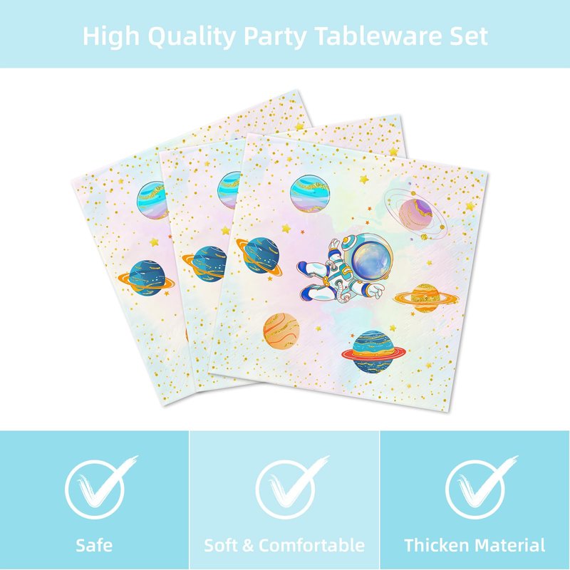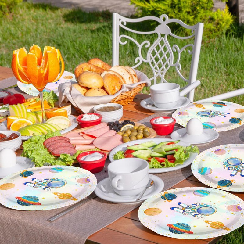- Astronaut Party Decorations:Elevate your birthday celebration with our space birthday party decorations package for 24 guests. This set includes 24 space plates (9 in), 24 space plates dessert plates (7 in), 24 napkins (6.5 in), and 24 forks (6.5 in)