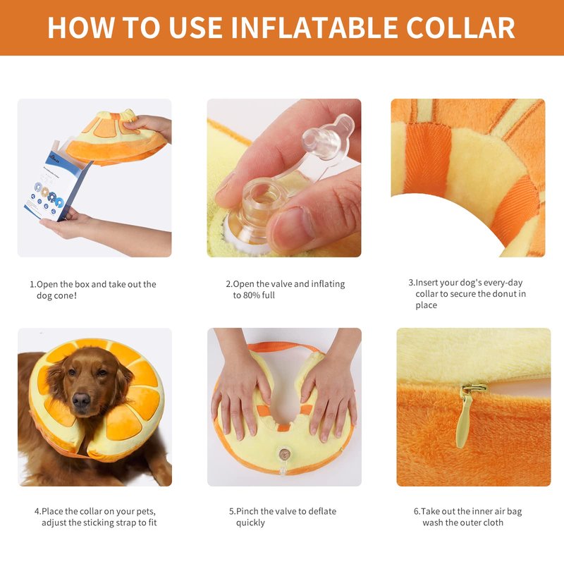 Our donut collar for dogs after surgery are very lightweight and can be easily folded to save space when deflated. The bright colors and orange design make this inflatable dog cone even more adorable. Therefore, you can easily carry them on any occasion.