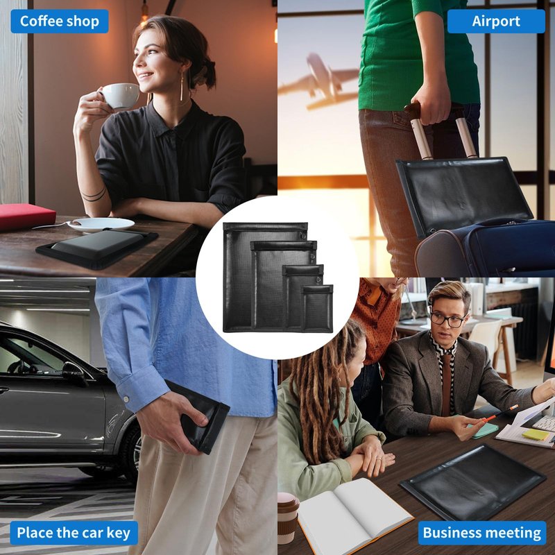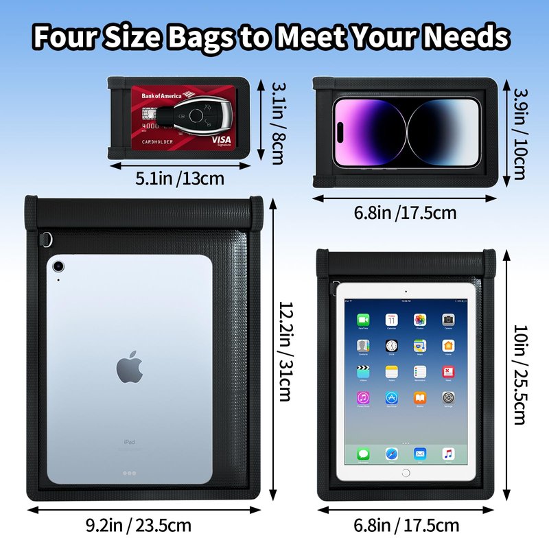 - [4 Packs Faraday Kits] --Our EMP bags Faraday includes 4 different sizes to meet all your needs, effectively securing your credit cards, car key fobs, passports, cell phones, tablets, Bluetooth devices, GPS units, and transponders all at once.